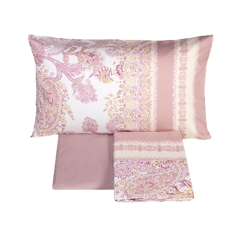 Raso di puro cotone 300TC stampato in digitale.Il lenzuolo copriletto e le federe sono stampati. Il lenzuolo con angoli è in tinta unita.